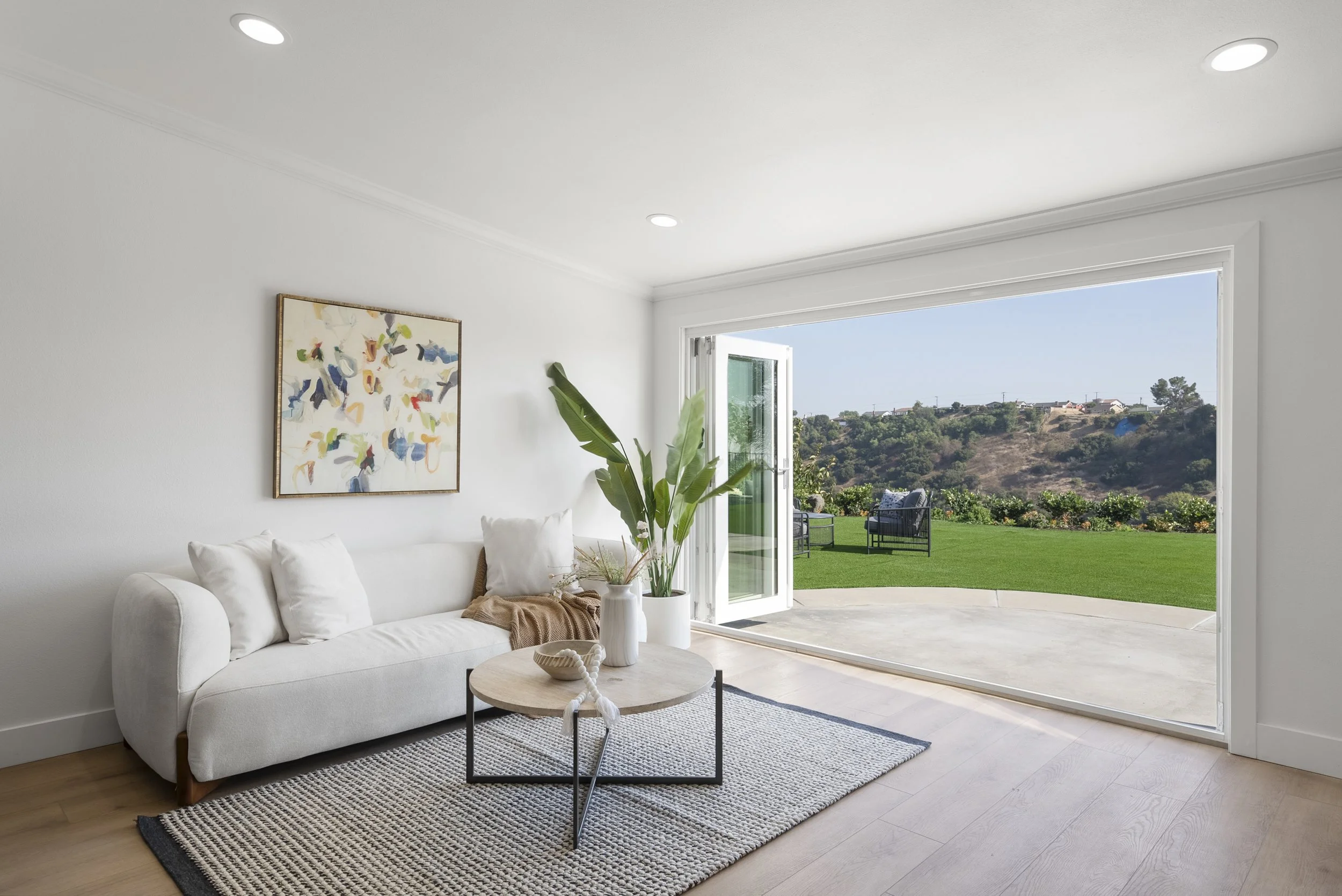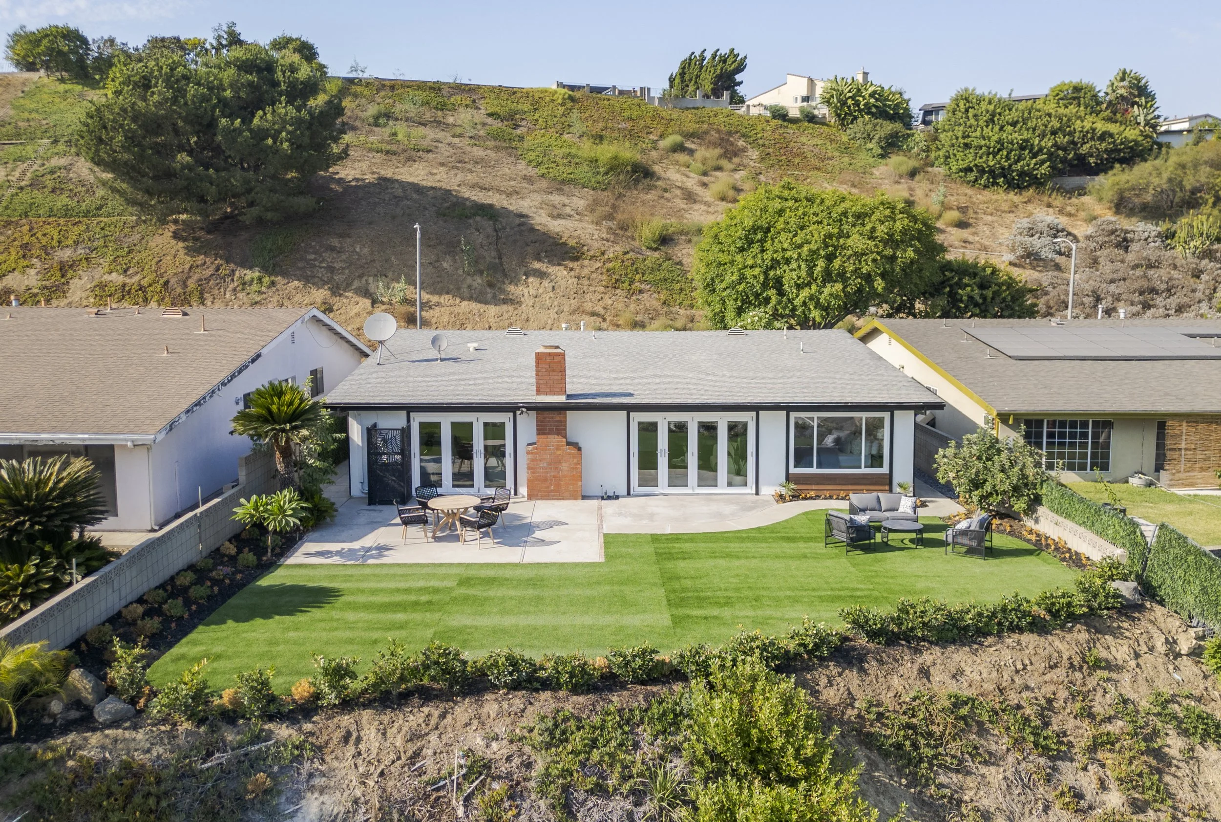 Nestled in the hills of Monterey Highlands, this exceptionally renovated mid-century gem offers a perfect blend of style and warmth, framed by sweeping views. The living room, with its sleek black-tiled fireplace, is filled with natural light streaming through bi-fold glass doors, creating a space that feels both open and inviting. A thoughtfully designed wet bar with vertical wood slat finishes adds a touch of texture and charm, beautifully complementing the smooth white countertop. The dining area also features bi-fold doors, seamlessly extending your living space outdoors, where you can enjoy moments of alfresco dining, entertaining, or simply soaking in the breathtaking views. The kitchen shines with natural wood-tone cabinets, Samsung appliance suite, and elegant glass mosaic tile backsplash, adding a layer of sophistication to its modern design. This home offers three bright and airy bedrooms, including a primary suite complete with a walk-in cedar closet and a beautifully updated bathroom, embracing simplicity and a minimalist aesthetic. Amenities include an attached two-car garage and an upgraded HVAC system. Located with easy access to DTLA, local parks, restaurants, schools, and major freeways, this home combines the tranquility of hillside living with the convenience of city life.