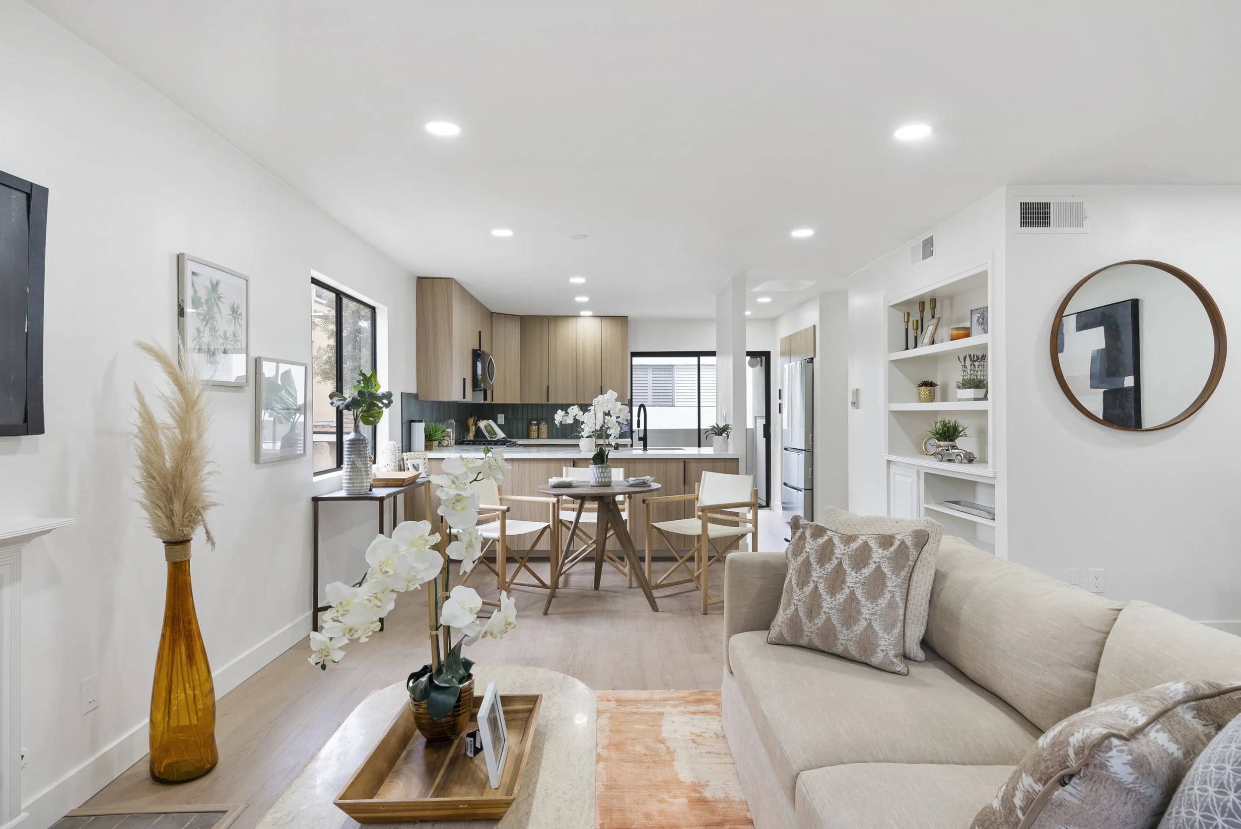 Situated on a tranquil street in North Alhambra, near San Marino and South Pasadena, this fully updated corner unit townhome boasts an ideal open layout in a serene setting at the rear of a 22-unit complex. The thoughtfully designed living, dining, and kitchen area features composite wide plank vinyl floors, high ceilings, LED recessed lights, and tall baseboard trim throughout. The cozy living room includes a fireplace and built-in bookcase, while the open-concept kitchen offers an LG appliance suite, quartz countertops, ample storage, and a midori green matte ceramic backsplash. The sunlit upper level houses a master suite with a newly renovated en-suite bathroom, complete with a floating vanity, modern fixtures, and tile. The primary bedroom also includes generous closet space and a balcony finished with epoxy. The second bedroom, located across the hallway, features a large closet and windows that fill the room with natural light. The hall bathroom includes a shower over the tub, a floating vanity, and tiled walls. The lower level includes a bonus room that can serve as a den, office, gym, or extra storage space, along with a laundry room and access to the two-car garage. Conveniently located near major freeways, shops, restaurants, and schools, this newly updated corner unit offers both comfort and convenience.